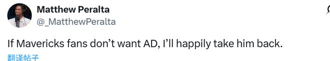 对此,湖人记者Matthew Peralta发文力挺浓眉:“如果独行侠球迷不想要AD,我很乐意把他接回来。”